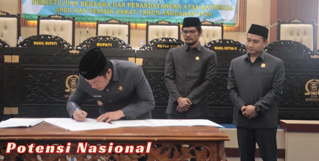 Pesisir Barat, Potensinasional.id — Pemerintah Kabupaten Pesisir Barat (Pesibar) bersama DPRD resmi menyepakati dan menandatangani Rancangan Peraturan Daerah (Ranperda) Anggaran Pendapatan dan Belanja Daerah (APBD) Tahun Anggaran 2026. Penandatanganan dilakukan dalam rapat paripurna yang digelar di ruang sidang DPRD Pesibar, Jumat (21/11/2025).