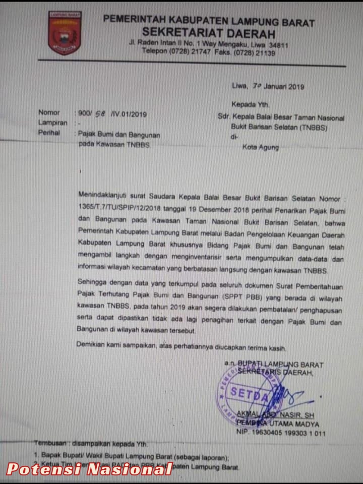 Lampung Barat, Potensi Nasional – Fakta penarikan Pajak Bumi dan Bangunan (PBB) di kawasan Taman Nasional Bukit Barisan Selatan (TNBBS) Kabupaten Lampung Barat kembali mencuat setelah Camat Bandar Negeri Suoh (BNS), Mandala Harto, membenarkan adanya pungutan tersebut. Pernyataan ini sekaligus membantah klaim Kepala Badan Pendapatan Daerah (Bapenda) Lampung Barat, Daman Nasir, yang sebelumnya menyatakan bahwa pemerintah daerah tidak pernah menarik PBB dari masyarakat yang bermukim di lahan konservasi.