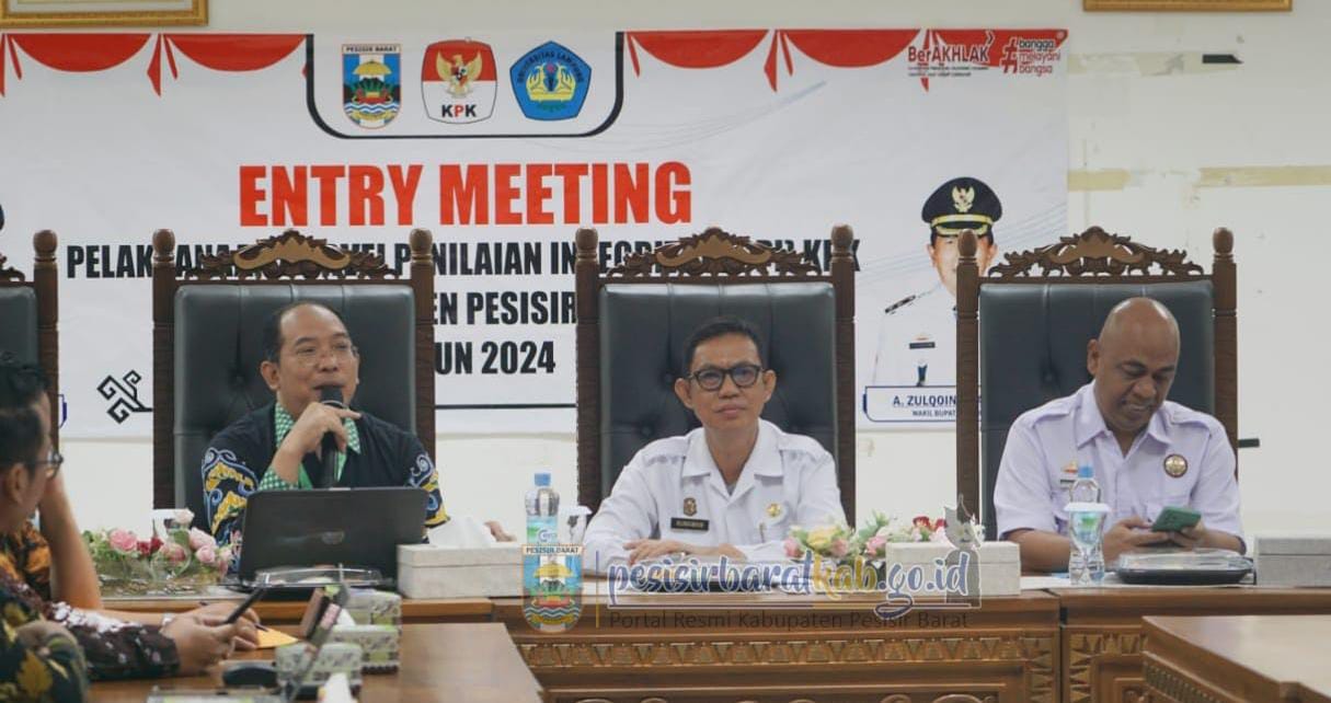PESISIR BARAT, POTENSI NASIONAL-Kepala Dinas Komunikasi, Informatika, Statistik dan Persandian (Diskominfotiksan), Suryadi, S.IP., M.M., menginformasikan bahwa, Asisten III Bidang Administrasi Umum Sekretariat Pemerintah Kabupaten (Pemkab) Pesisir Barat (Pesibar), Drs. Gunawan, M.Si., membuka kegiatan entry meeting pelaksanaan Survei Penilaian Integritas (SPI) Komisi Pemberantasan Korupsi (KPK) di Pesibar Tahun 2024, di ruang rapat Bupati Lantai 4 Gedung A Komplek Perkantoran Pemkab Pesibar, Rabu (13/11/2024).