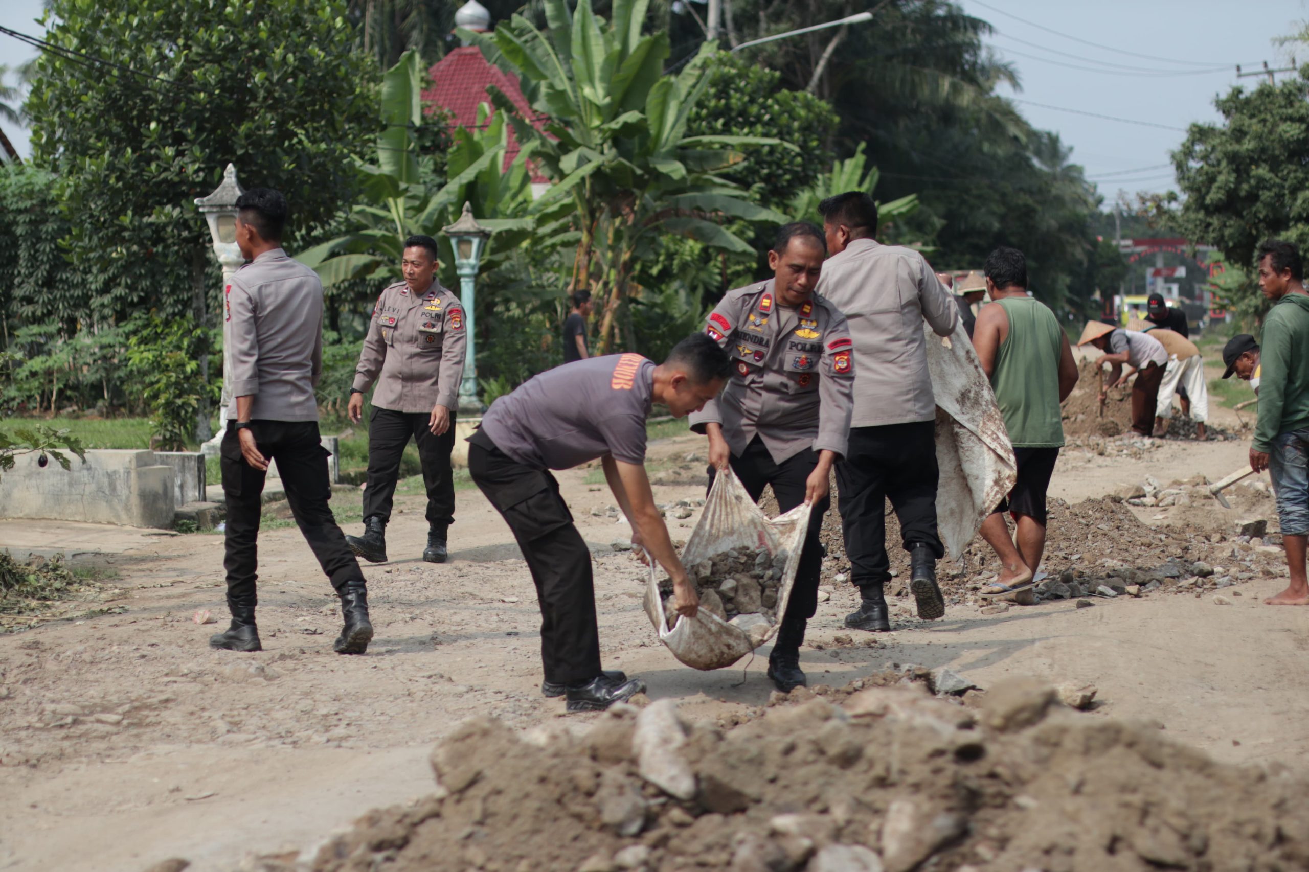 LAMPUNG, POTENSINASIONAL – Anggota Brimob Polda Lampung bergotong royong menimbun jalan desa di Kabupaten Lampung Tengah.