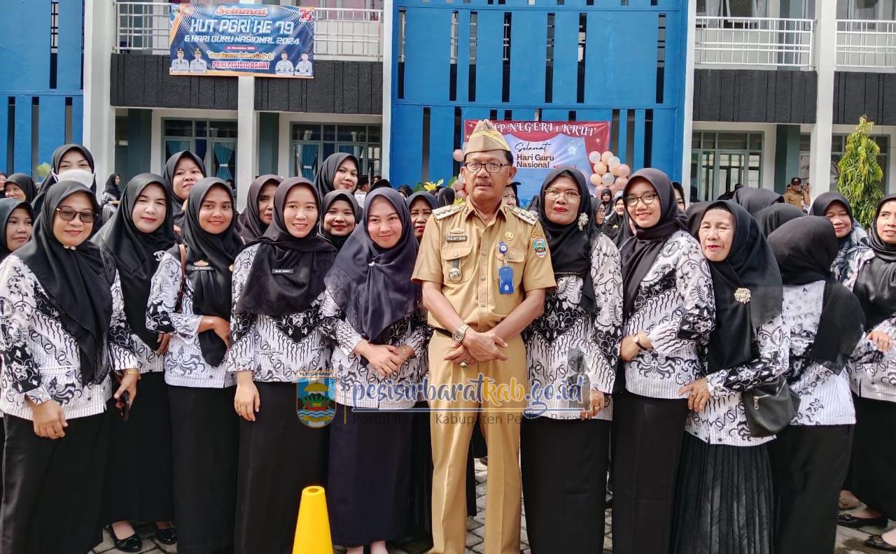 PESISIR BARAT, POTENSI NASIONAL-Kepala Dinas Komunikasi, Informatika, Statistik dan Persandian (Diskominfotiksan), Suryadi, S.IP., M.M., menginformasikan bahwa, Bupati Pesisir Barat (Pesibar), Dr. Drs. Agus Istiqlal, S.H., M.H., menghadiri sekaligus memimpin upacara peringatan Hari Ulang Tahun (HUT) Persatuan Guru Republik Indonesia (PGRI) ke-79 dan Hari Guru Nasional dengan tema Guru Hebat Indonesia Kuat, di SMPN 1 Krui Kecamatan Pesisir Tengah, Senin (25/11/2024).
