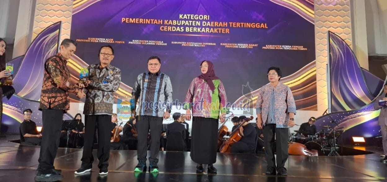 PESISIR BARAT, POTENSINASIONAL-Kepala Dinas Komunikasi, Informatika, Statistik, dan Persandian (Diskominfotiksan), Suryadi, S.IP., M.M., menginformasikan bahwa, Bupati Pesisir Barat (Pesibar), Dr. Drs. Agus Istiqlal, S.H., M.H., menerima penghargaan Kabupaten Cerdas Berkarakter dari Kementerian Pendidikan, Kebudayaan, Riset, dan Teknologi (Kemendikbudristek), di Plaza Insan Berprestasi Kemendikbudristek, Jakarta Pusat, Senin (7/10/2024) malam.
