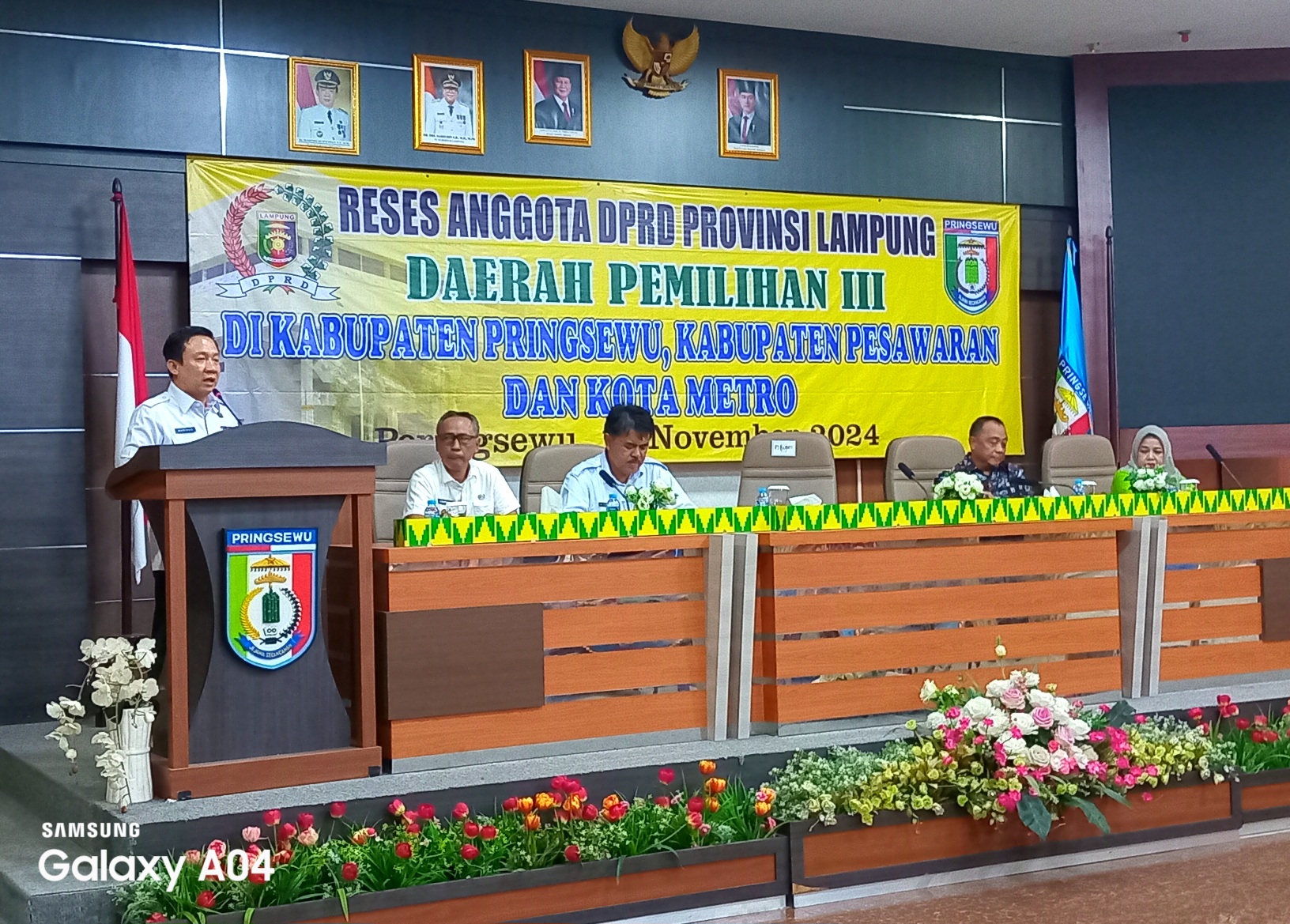 Pj Bupati Pringsewu Marindo Kurniawan menyambut baik kegiatan reses di Kabupaten Pringsewu oleh anggota DPRD Provinsi Lampung khususnya dari Dapil III. Pj Bupati berharap kegiatan reses ini dapat menyerap banyak aspirasi dari masyarakat Pringsewu, guna lebih meningkatkan laju pembangunan di Kabupaten Pringsewu.