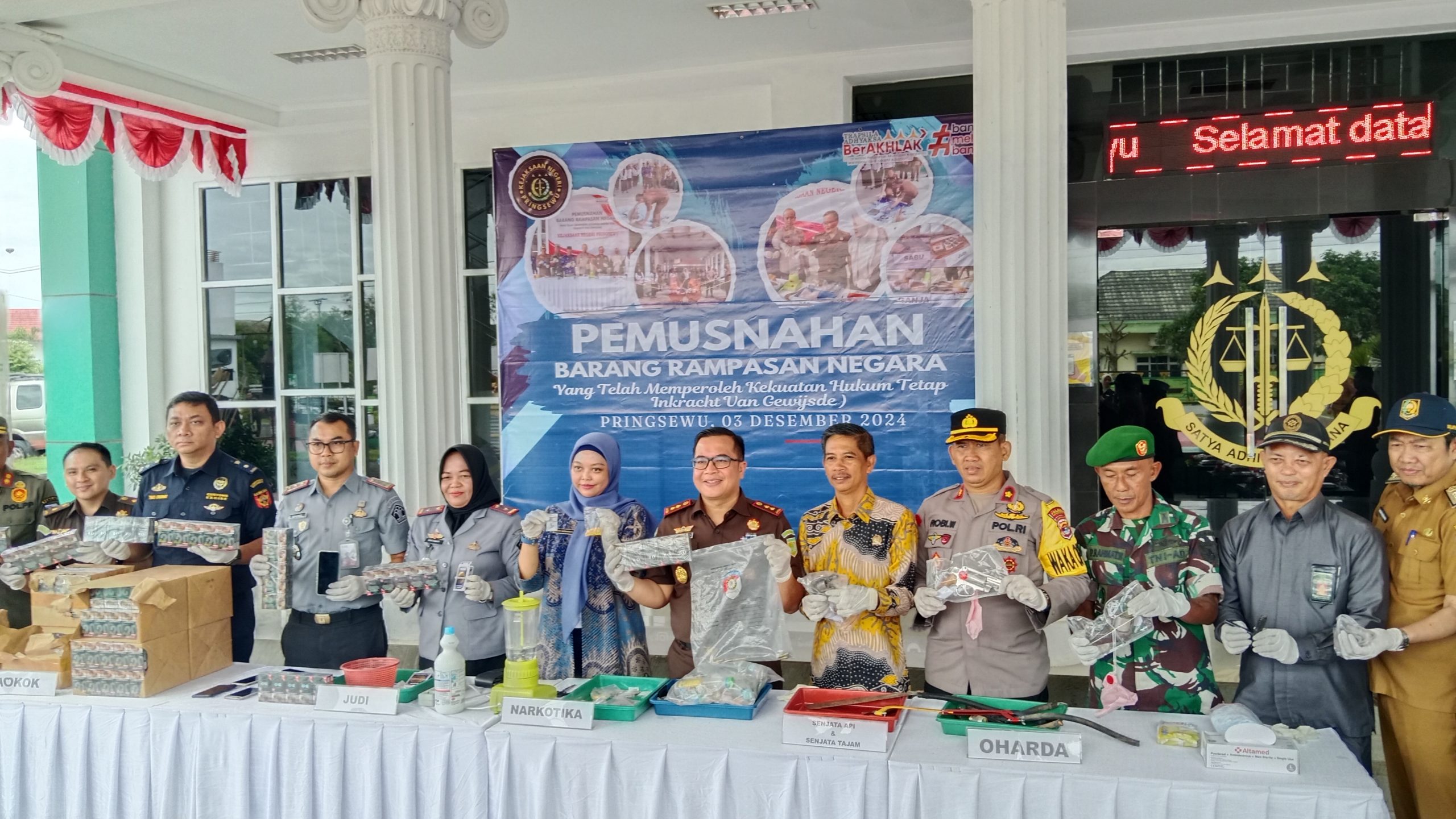 Kejaksaan Negeri Pringsewu melaksanakan kegiatan pemusnahan barang rampasan negara pada Selasa (3/12/2024) di halaman kantor Kejari Pringsewu. Acara ini dihadiri sejumlah pejabat terkait, baik secara langsung maupun diwakilkan, Selasa (02/12/2024).