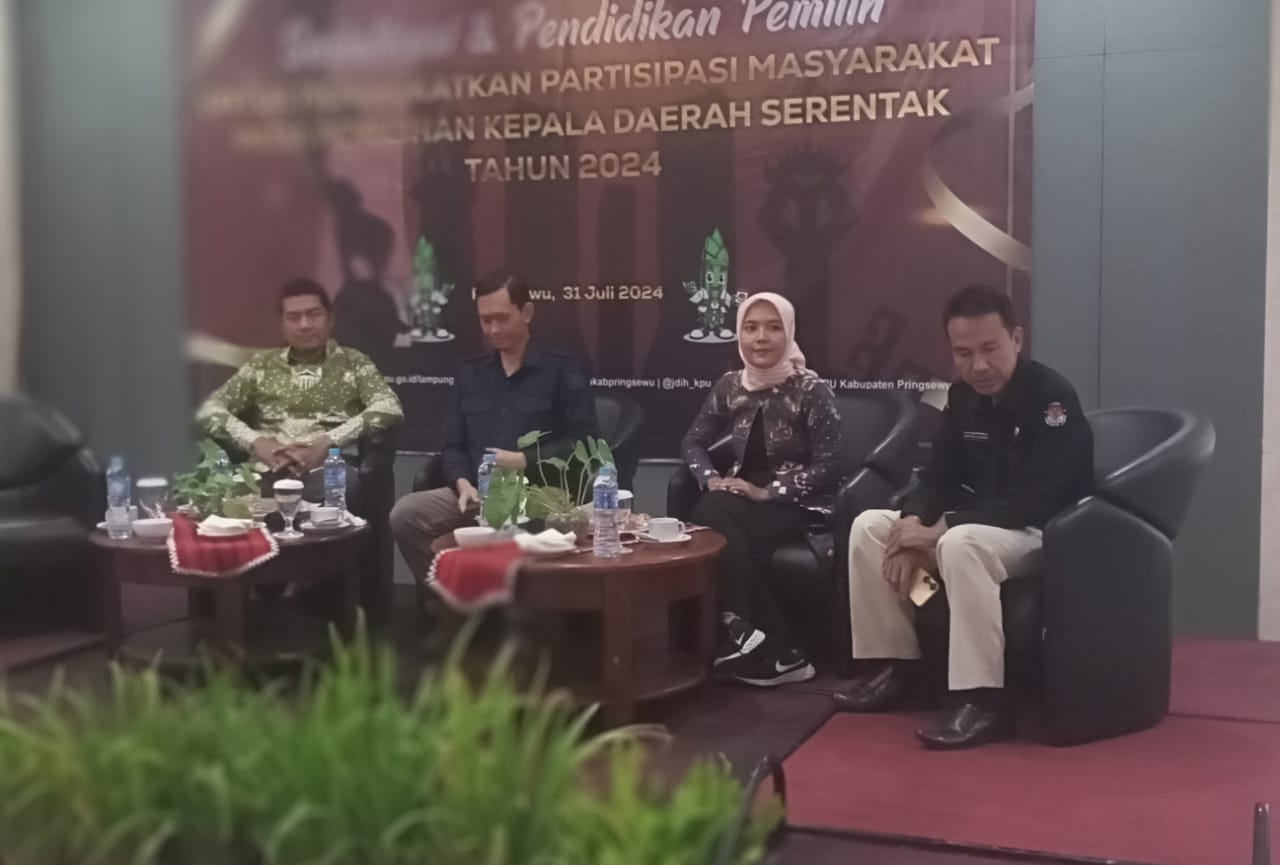 Pringsewu, Potensinasional – Komisi Pemilihan Umum (KPU) Kabupaten Pringsewu menggelar acara sosialisasi dan pendidikan pemilihan umum yang bertujuan untuk meningkatkan partisipasi masyarakat dalam Pilkada serentak tahun 2024. Acara ini diadakan di Hotel Urban Pringsewu pada hari Rabu (31/7/2024).