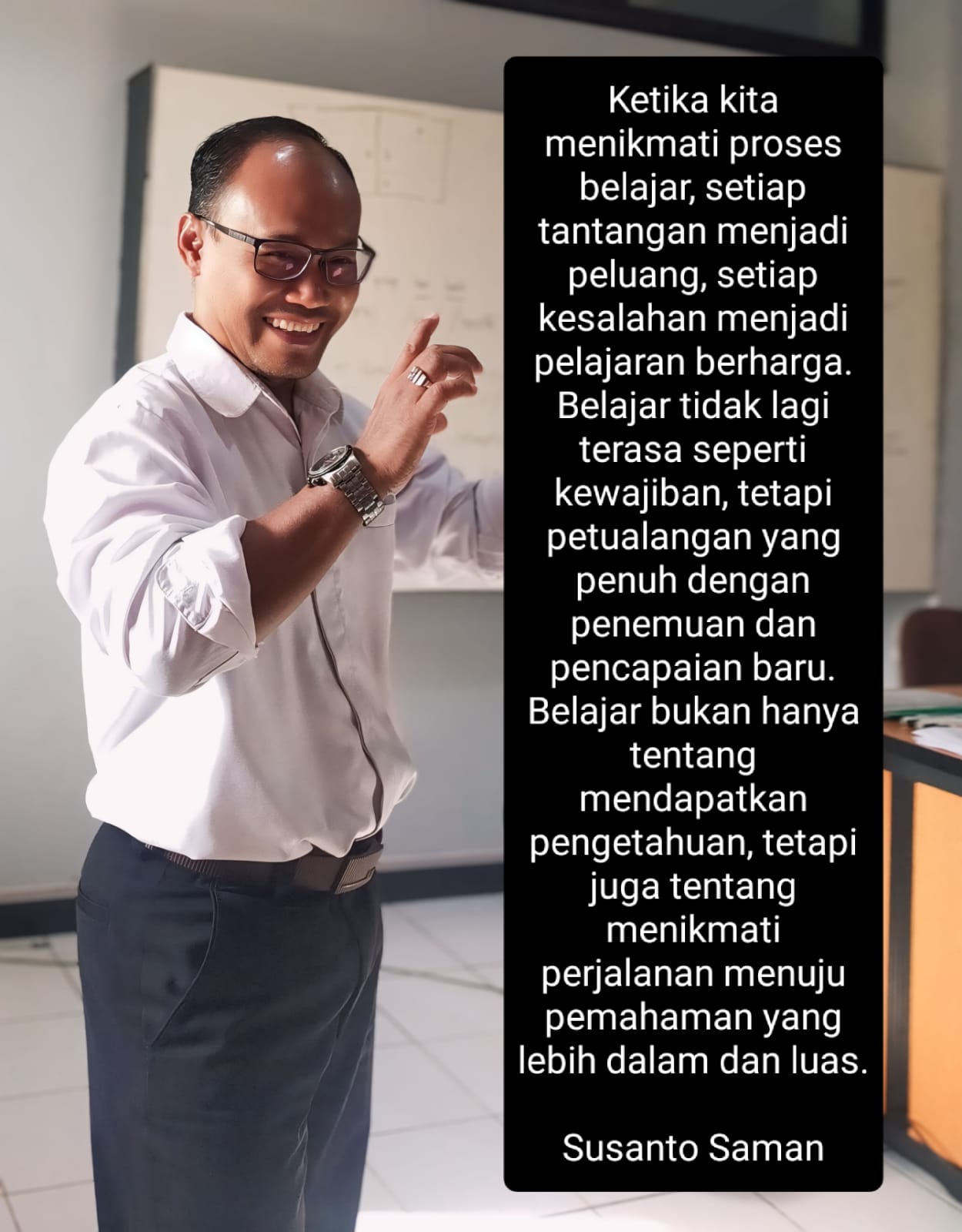 Belajar bukan hanya tentang memperoleh pengetahuan, tetapi juga tentang menikmati setiap langkah dalam perjalanan menuju pemahaman yang lebih dalam dan luas. Ketika kita menikmati proses belajar, setiap tantangan menjadi peluang dan setiap kesalahan menjadi pelajaran berharga. Dengan pendekatan yang positif dan metode yang menyenangkan, belajar tidak lagi terasa seperti kewajiban, tetapi menjadi petualangan yang penuh dengan penemuan dan pencapaian baru. Sebaiknya kita mulai ubah cara pandang kita terhadap belajar dan kita mulai nikmati setiap momen dalam proses tersebut, karena itulah salah satu kunci untuk mencapai kesuksesan sejati dalam pendidikan dan kehidupan. Kepala Pusat Studi Linguistik, Universitas Bandar Lampung