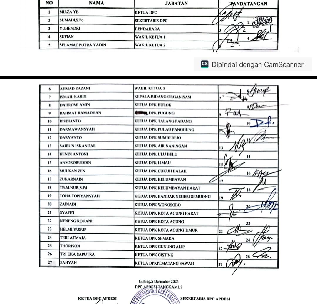 Dalam lembaran yang telah dibubuhi tandatangan Ketua DPC Apdesi Kabupaten Tanggamus Mirza, Sekretaris Sumadi, Bendahara Hi. Yuhendri, Wakil ketua 1 Sufian dan Wakil Ketua 2 Selamat Putra Yadin serta seluruh Pengurus DPK Apdesi se- Kabupaten Tanggamus, terkesan membuat peraturan sepihak.