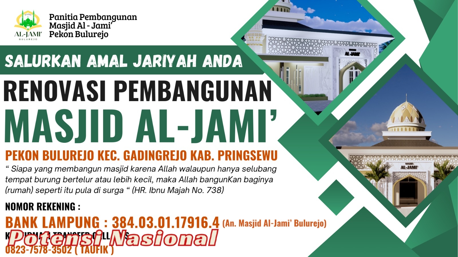 Pringsewu, Potensinasional.id — Open Turnamen Al Jami Cup I resmi dibuka di Lapangan Pekon Bulurejo, Kecamatan Gading Rejo, Kabupaten Pringsewu. Turnamen ini digelar sebagai ajang silaturahmi sekaligus upaya penggalangan donasi untuk pembangunan Masjid Al Jami di Pekon Bulurejo.