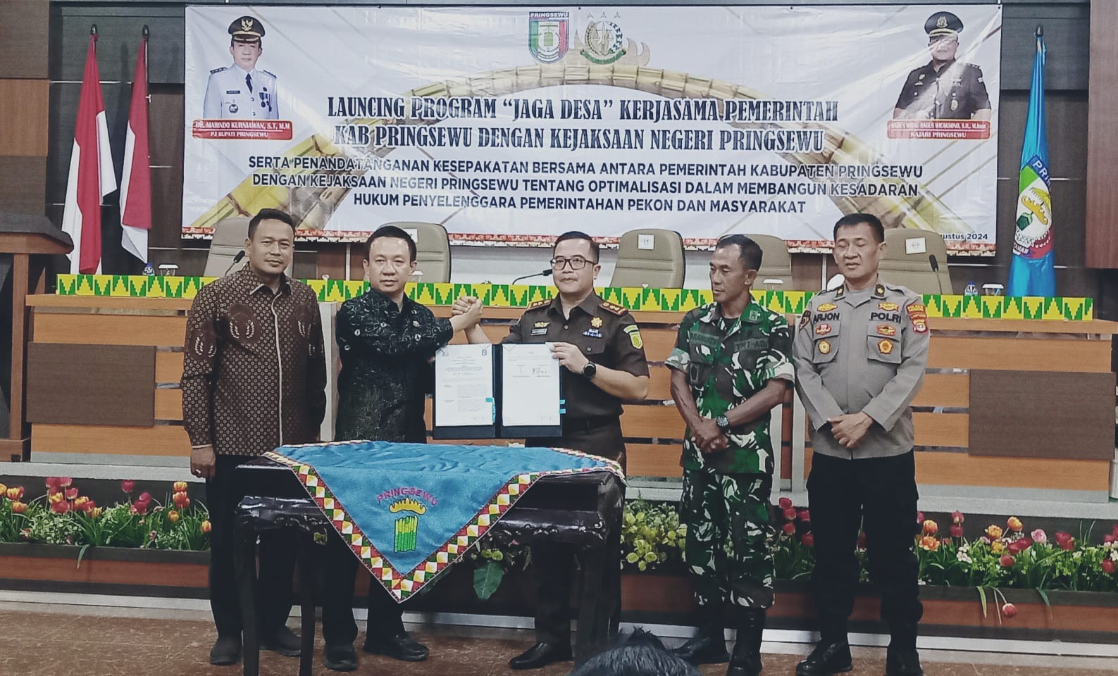 PRINGSEWU, POTENSINASIONAL– Pemerintah Kabupaten (Pemkab) Pringsewu bersama Kejaksaan Negeri (Kejari) Pringsewu melaunching Program Jaksa Garda Desa (Jaga Desa). Acara launching sekaligus penandatanganan kerjasama kedua institusi oleh Pj.Bupati Pringsewu Marindo Kurniawan dan Kajari Pringsewu Raden Wisnu Bagus Wicaksono dalam rangka Optimalisasi Dalam Membangun Kesadaran Hukum Penyelenggara Pemerintahan Desa dan Masyarakat dilaksanakan di Aula Utama Pemkab Pringsewu, Kamis (22/8/2024).