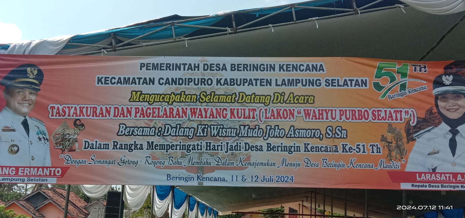 “Adapun puncak acara ulang tahun Bersih Desa akan menampilkan berbagai hiburan masyarakat, termasuk Hadroh, Istighosah,Wayang kulit semalam suntuk Dalang Ki Wisnu Mudo Joko Asmoro. S.Sn. Dengan lakon ( Wahyu Purbo Sejati ) dari Lampung timur yang akan di gelar dalam rangka menyambut hari ulang tahun bersih Desa yang ke 51 Desa Beringin kencana kecamatan Candipuro kabupaten Lampung Selatan serta penampilan dan hiburan lainnya.