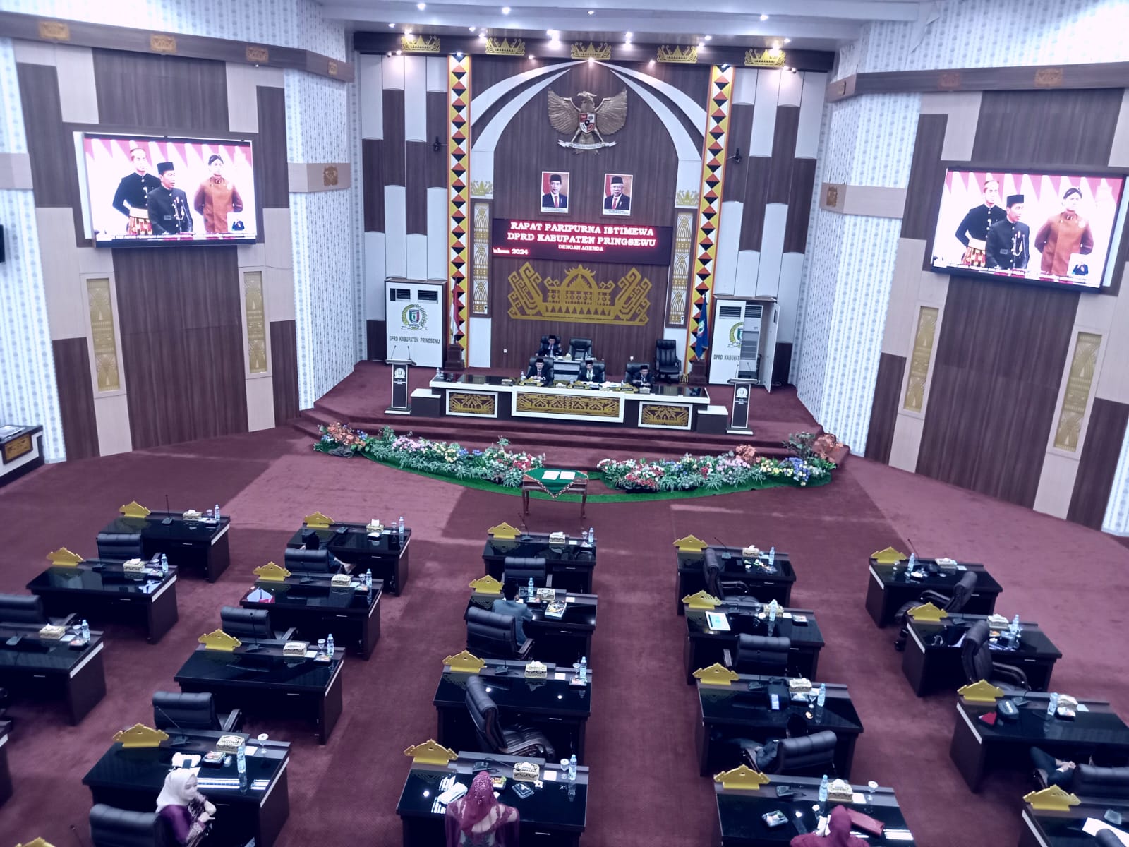 PRINGSEWU, POTENSINASIONAL — Rapat Paripurna Istimewa dengan agenda mendengarkan pidato kenegaraan Presiden Republik Indonesia pada sidang tahunan MPR RI dan sidang bersama DPR RI dan DPD RI dalam rangka peringatan HUT ke-79 Proklamasi Kemerdekaan Republik Indonesia digelar oleh DPRD Kabupaten Pringsewu, Jumat (16/08/2024).