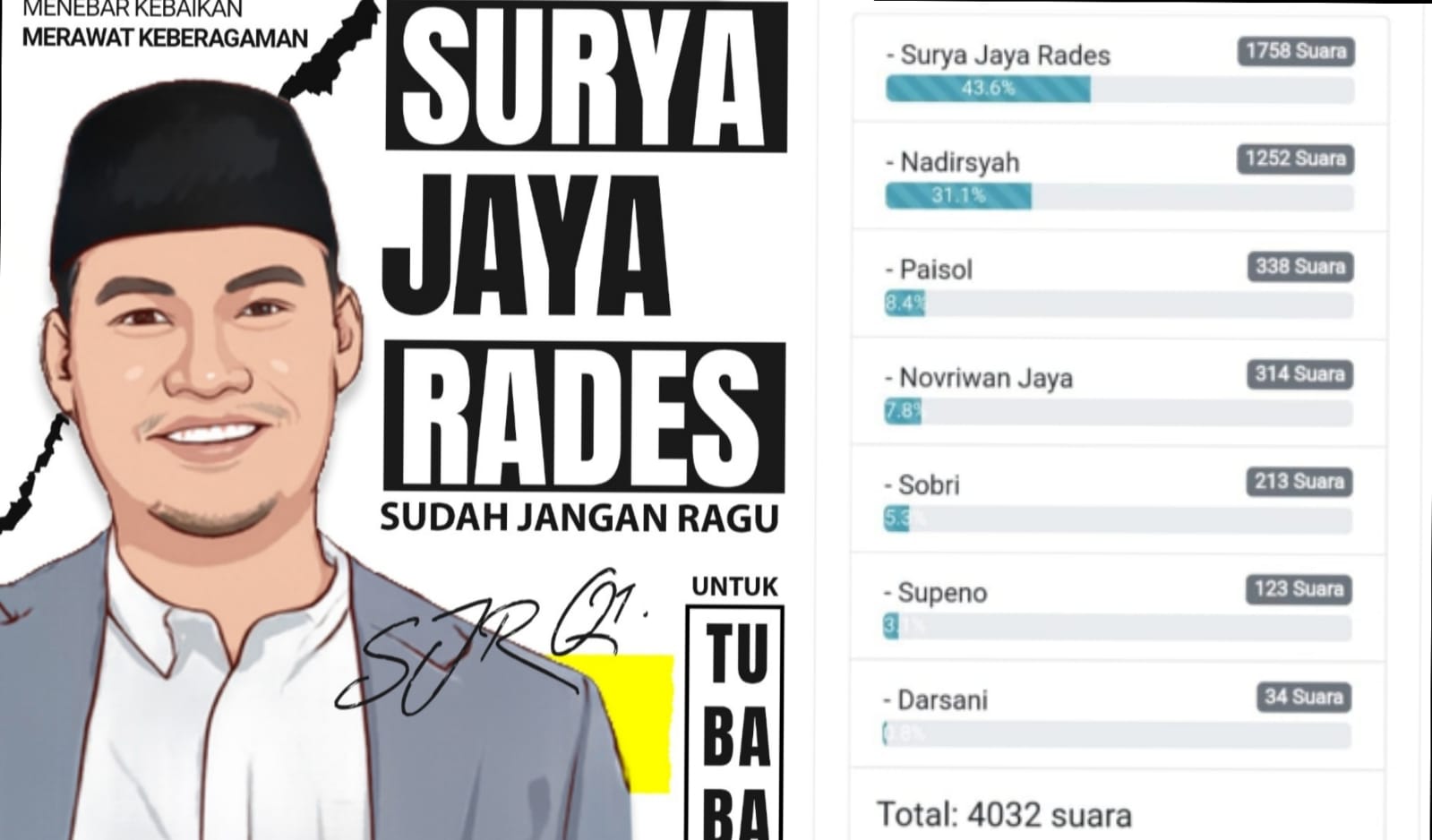 Dengan pertanyaan yang disajikan dalam polling tersebut, Siapa Bakal Calon Bupati Tubaba yang anda Favoritkan ?, memposisikan ketujuh nama tersebut dengan peroleh tanggapan dukungan dari 4032 suara.
