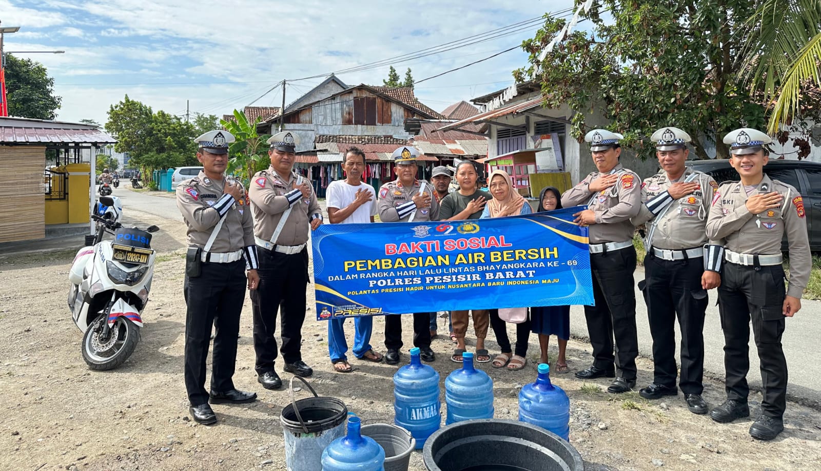 Pesisir Barat, POTENSINASIONAL -Dalam rangka memperingati Hari Ulang Tahun (HUT) Lalu Lintas ke-69, Satuan Lalu Lintas (Sat Lantas) Polres Pesisir Barat melaksanakan kegiatan bakti sosial (baksos) dengan membagikan air bersih kepada warga. Kegiatan ini merupakan salah satu bentuk kepedulian Polri terhadap masyarakat, terutama dalam memenuhi kebutuhan air bersih yang sangat penting di Kecamatan Pesisir Tengah, Kabupaten Pesisir Barat, Selasa (10/9/24) pukul 10.00 Wib.