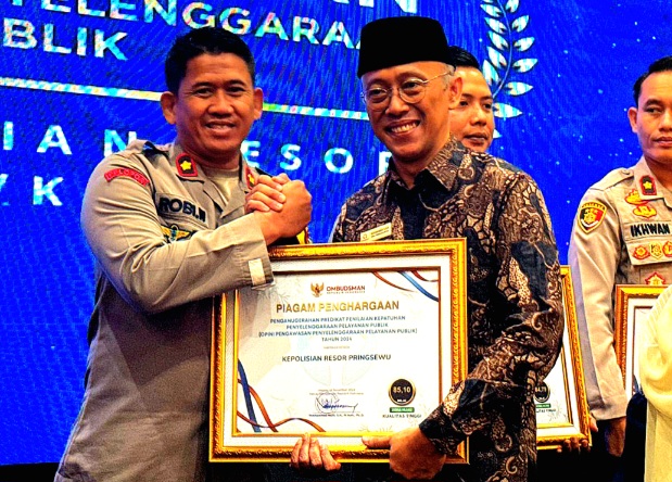 PRINGSEWU, POTENSI NASIONAL – Polres Pringsewu meraih penghargaan dari Ombudsman Republik Indonesia (ORI). Penghargaan diberikan karena kepolisian resor tersebut mendapat predikat kepatuhan penyelenggaraan pelayanan publik tertinggi dengan nilai 85.10 atau kategori hijau pada 2024 ini. Piagam penghargaan diterima oleh Wakapolres Pringsewu Komisaris Polisi Robi Bowo Wicaksono di Ballroom Hotel Emersia, Bandar Lampung, pada Kamis (12/12/2024).