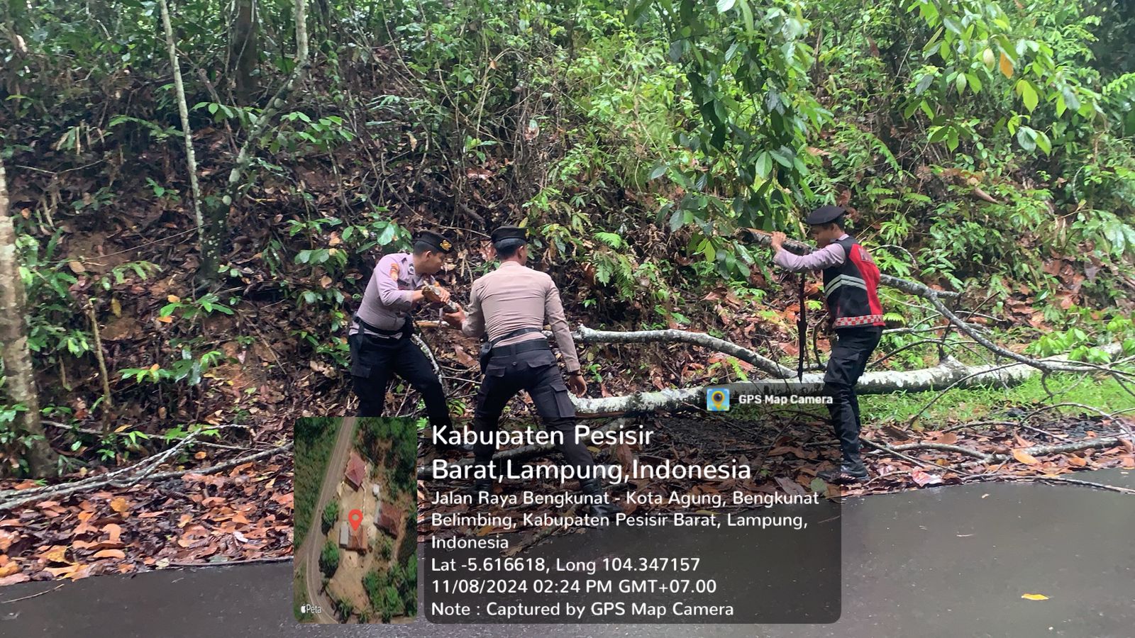 Anggota Polsek Bengkunat langsung terjun ke lokasi untuk melakukan evakuasi pohon tersebut. Proses pembersihan berlangsung lancar dengan cara bergotong royong menggeser pohon yang semula melintang di tengah jalan dan meletakkan pohon tersebut ke pinggir jalan.