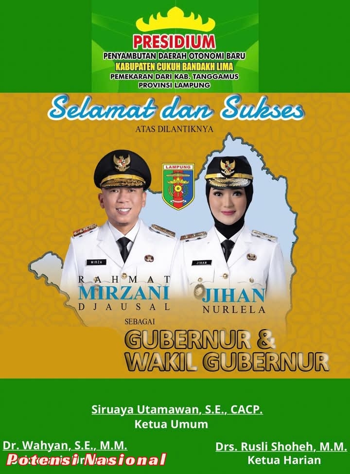 Lampung, potensi nasional – Presidium Penyambutan Daerah Otonomi Baru (DOB) Kabupaten Cukuh Bandakh Lima resmi mengumumkan pelantikan Rahmat Mirzani Djausal sebagai Gubernur dan Jihan Nurlena sebagai Wakil Gubernur. Dengan harapkan Kabupaten Cukuh Bandakh Lima merupakan hasil pemekaran dari Kabupaten Tanggamus, Provinsi Lampung. Kamis (20/2).