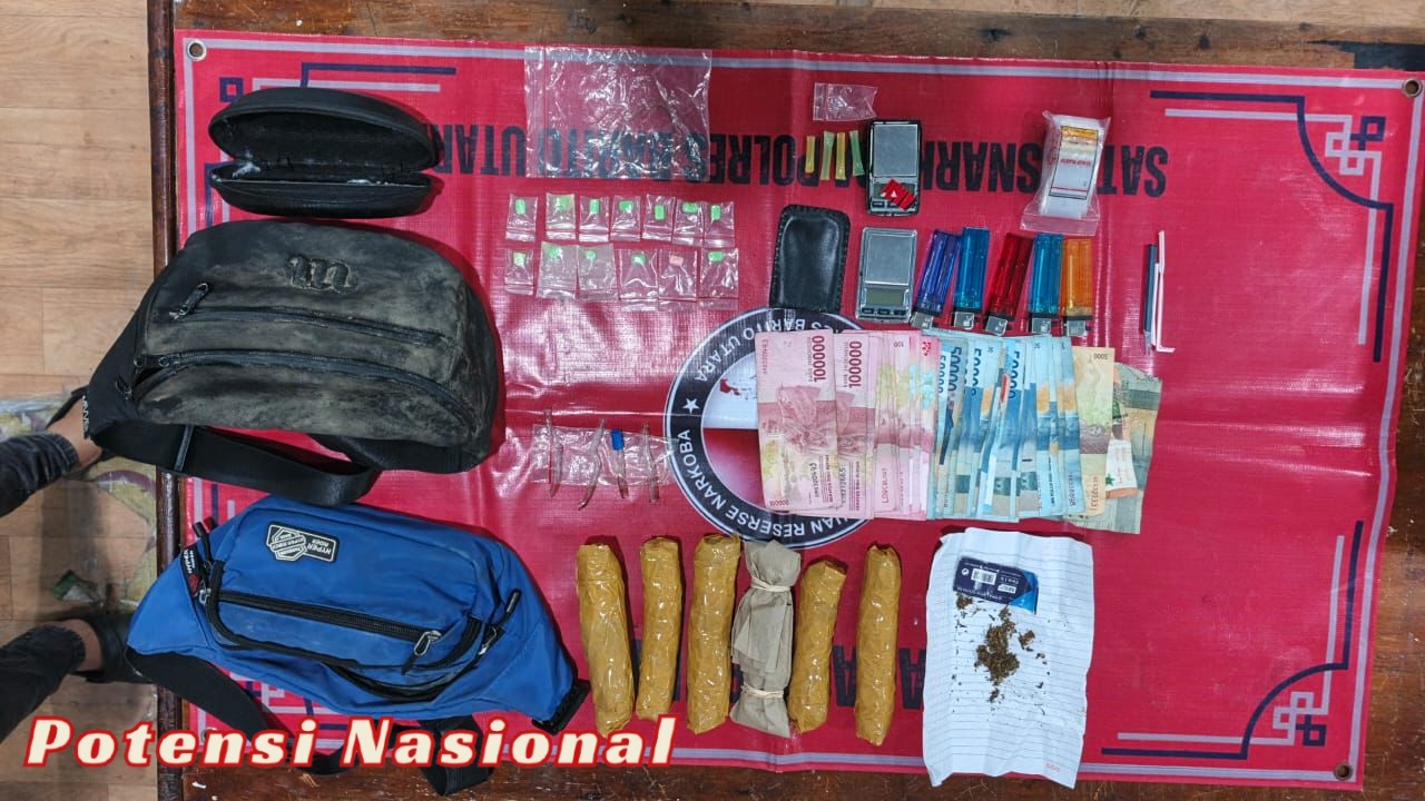Barang bukti yang diamankan antara lain 13 butir ekstasi dengan berat kotor 6,04 gram dan 7 paket ganja seberat 164,91 gram. Selain itu, turut disita dua timbangan digital, pipet kaca, plastik klip, sedotan, korek api, tas selempang, uang tunai Rp 2.324.000, handphone, serta satu unit sepeda motor Yamaha Fino warna merah maron.