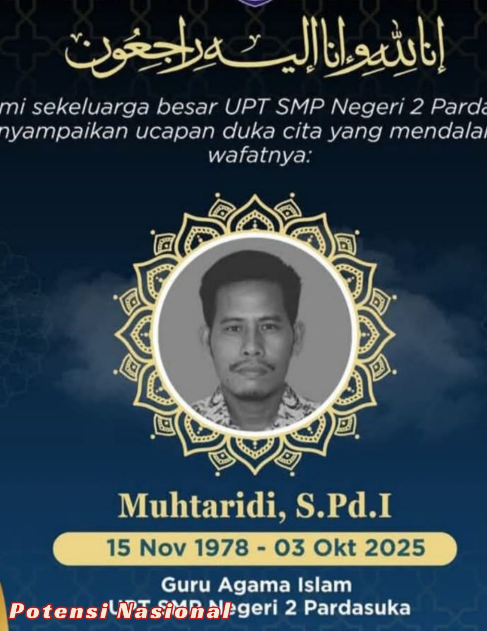 Pringsewu, Potensinasional.id, 6 Oktober 2025 – Suasana haru menyelimuti pelaksanaan upacara bendera di UPT SMP Negeri 2 Pardasuka pada Senin pagi. Upacara kali ini terasa berbeda karena sekolah tengah berduka atas wafatnya salah satu guru agama yang dicintai, Bapak Muhtaridi, pada Jumat (3/10/2025).