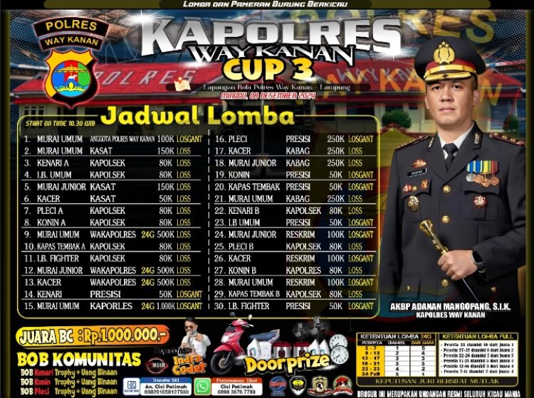 Ia menambahkan, perlombaan burung kicau Kapolres Way kanan Cup III tersebut dibuka secara umum Telah tersedia hadiah uang tunai jutaan rupiah serta tropy dan beragam doorprize sepeda motor, mesin cuci,kipas angin, magic com dan lainnya.